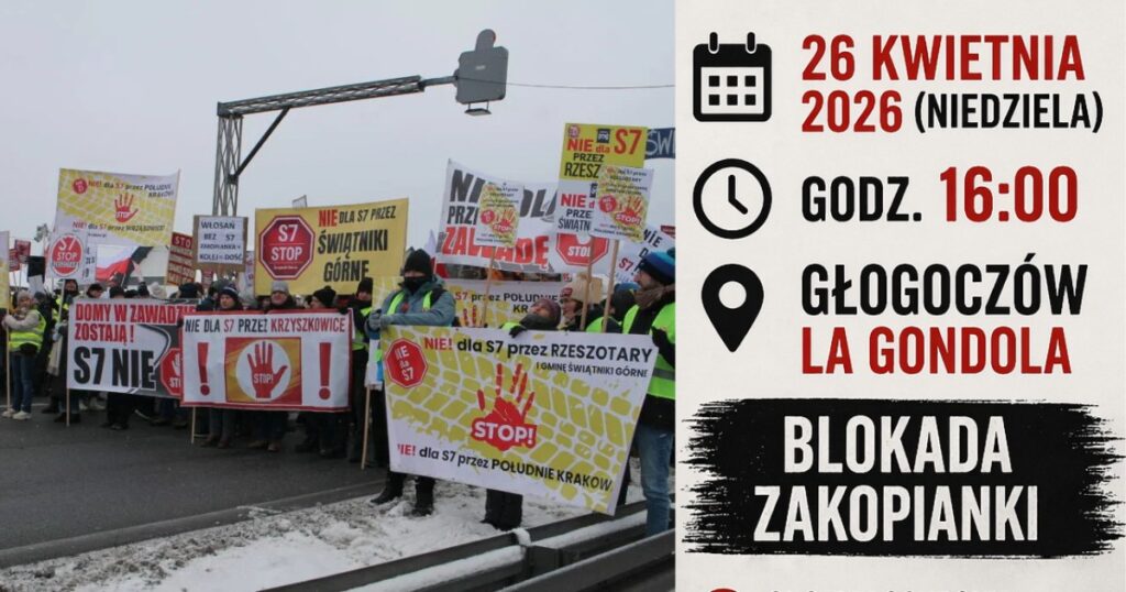 Na niedzielę, 26 kwietnia 2026 roku, zaplanowano kolejny protest w Głogoczowie (gmina Myślenice), dotyczący proponowanych przez Generalną Dyrekcję Dróg Krajowych i Autostrad wariantów przebiegu drogi S7 na odcinku Kraków–Myślenice.
