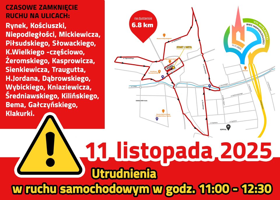 Ulice Myślenic po raz ósmy staną się trasą Biegu Niepodległości. We wtorek, 11 listopada, w godzinach od 11:00 do 12:30 odbędzie się VII Bieg Niepodległości w Myślenicach. W związku z organizacją wydarzenia część ulic zostanie czasowo wyłączona z ruchu samochodowego. Organizatorzy proszą mieszkańców o wcześniejsze usunięcie pojazdów z trasy biegu oraz o stosowanie się do poleceń służb porządkowych, które będą czuwać nad bezpieczeństwem uczestników i widzów.