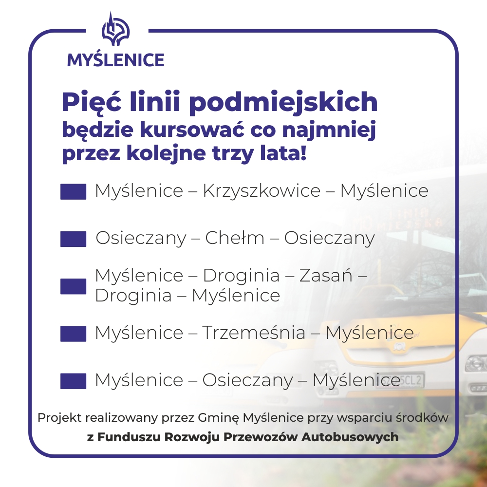 Pięć najczęściej wybieranych podmiejskich linii autobusowych na terenie Gminy Myślenice będzie funkcjonować również w 2026 roku. Decyzja Rady Miejskiej umożliwia zawarcie nowych umów z przewoźnikami i zapewnia ciągłość kursów na trasach, z których mieszkańcy korzystają na co dzień.
