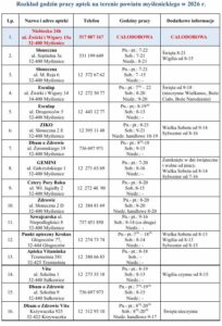 Na podstawie uchwały Zarządu Powiatu wyznaczono jedną aptekę na terenie całego powiatu, która w 2026 roku będzie pełnić dyżur nocny w systemie 24 godziny na dobę, 7 dni w tygodniu. Dyżur ten będzie realizować Apteka Niebieska, zlokalizowana przy ul. Żwirki i Wigury 15a w Myślenicach.